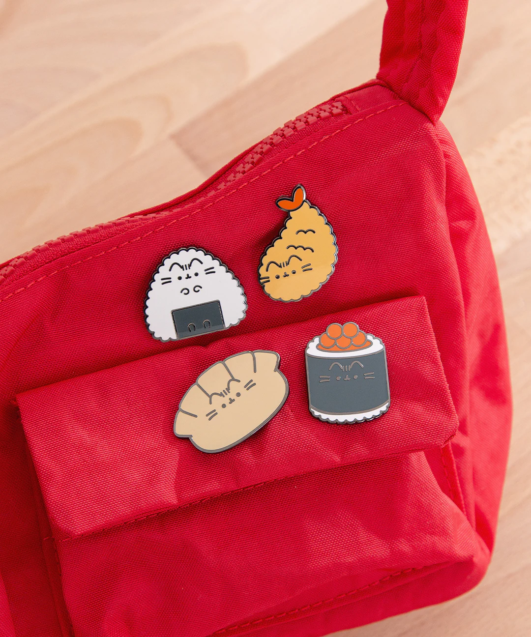 Bento Box Special! This Pusheen Shop Exclusive pin set includes gyoza, ikura sushi, shrimp tempura, and onigiri Pusheen pins that can be worn on hats, jackets, and more!