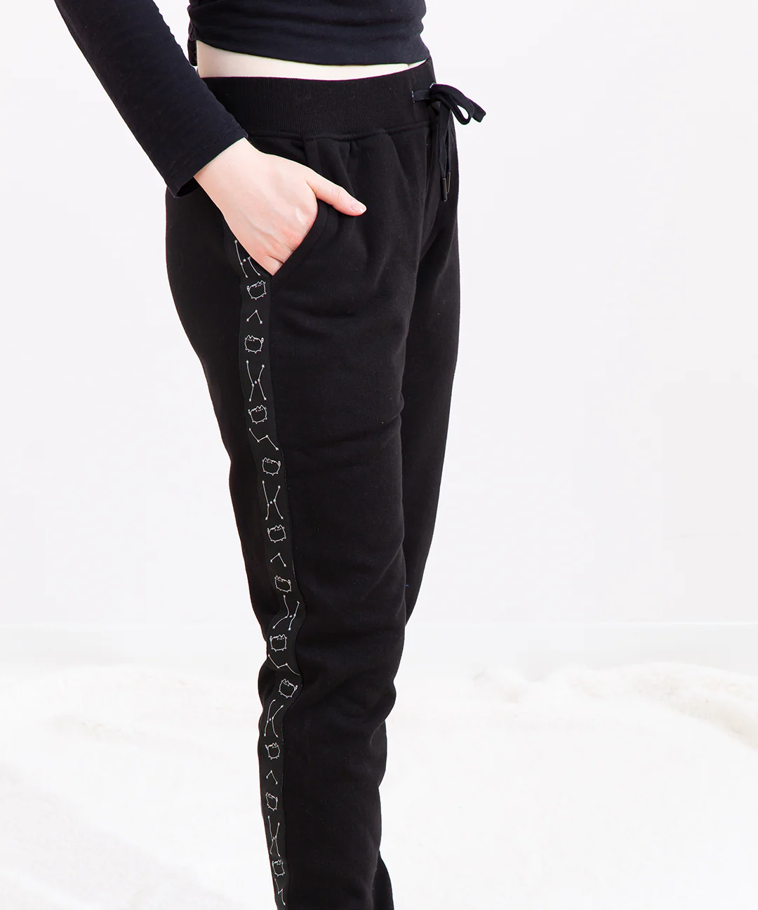 - Stylish woven tape with a celestial pattern runs along the pant legs.