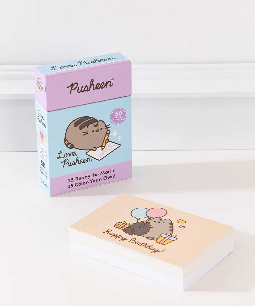 Spread joy to family & friends with this set of 50 adorable postcards featuringĀ Pusheen, Stormy, Pip, Sloth, and all their friends! This unique Pusheen Postcards Boxed Set features 25 ready-to-mail postcards & 25 postcards that you can color in yourself. Whether you're decorating your room or sending a note for a special occasion, these purrfect designs will brighten anyone's day!