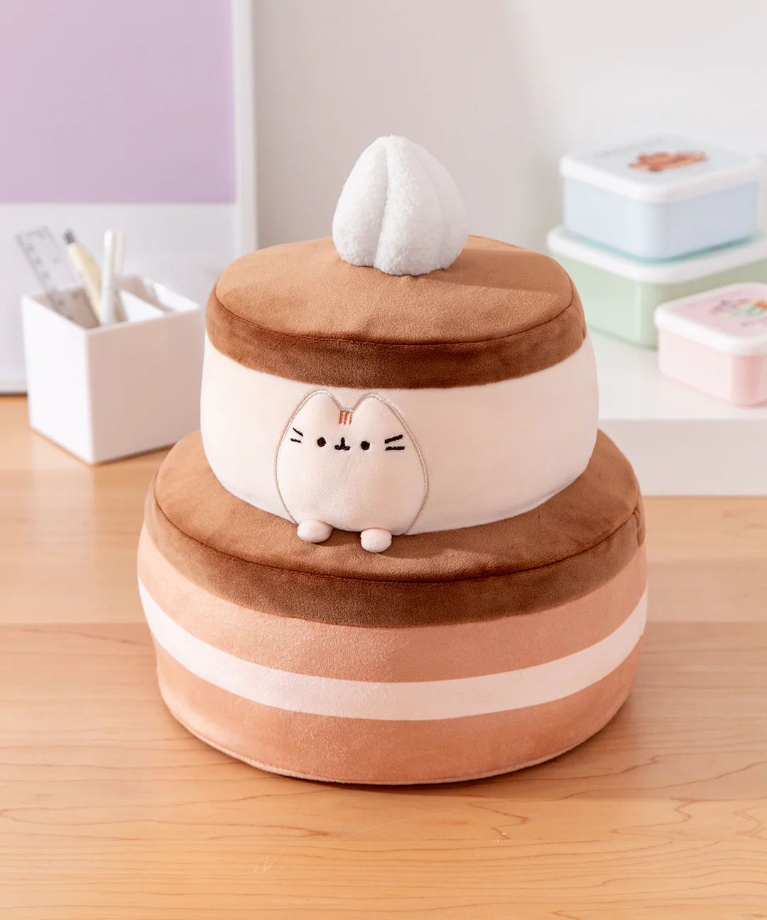 Celebrate every occasion like Pusheen would ā with cake and snuggles! This extra-large, two-tiered chocolate cake has everything collectors and foodies need to satisfy their sweet tooth. Tasty chocolate-brown hues and velvety-soft Squisheen material makes this 11ā cake a squishy, huggable treat. It also features a small, cream-colored Pusheen cake decoration and a white dollop of whipped cream. Squisheens are super-soft & squishy, and surface washable for easy cleaning.