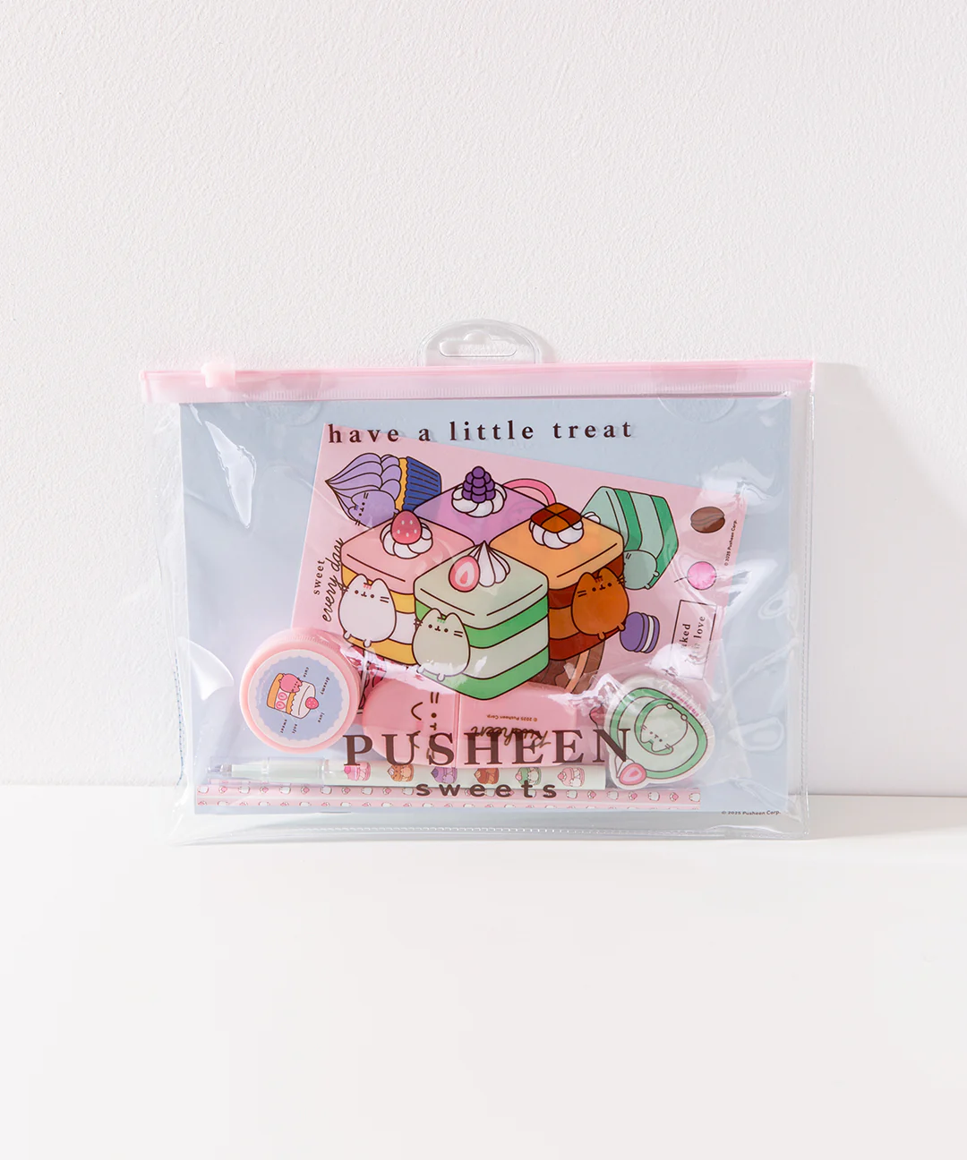 This adorable Pusheen Sweets Stationery Set has everything you might need for school or home! This must-have set contains Pusheen Sweets graphics on the 20-page lined notebook, sticker sheet, ballpoint pen, pencil, eraser, highlighter and sharpener. All items come packed in a reusable zip lock pouch, so you can take it wherever you go!