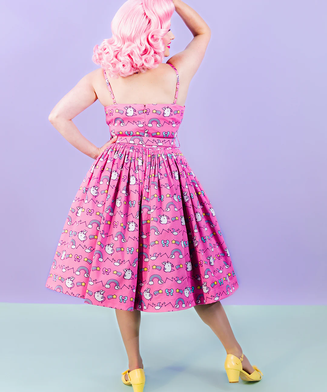 The perfect look this season is dreamy & vintage-inspired! The Pusheen x Sarsparilly Super Pusheenicorn Dreamer Dress is covered in a repeating pattern of Super Pusheenicorn among celestial clouds, rainbows, and stars and pink and mint bows.